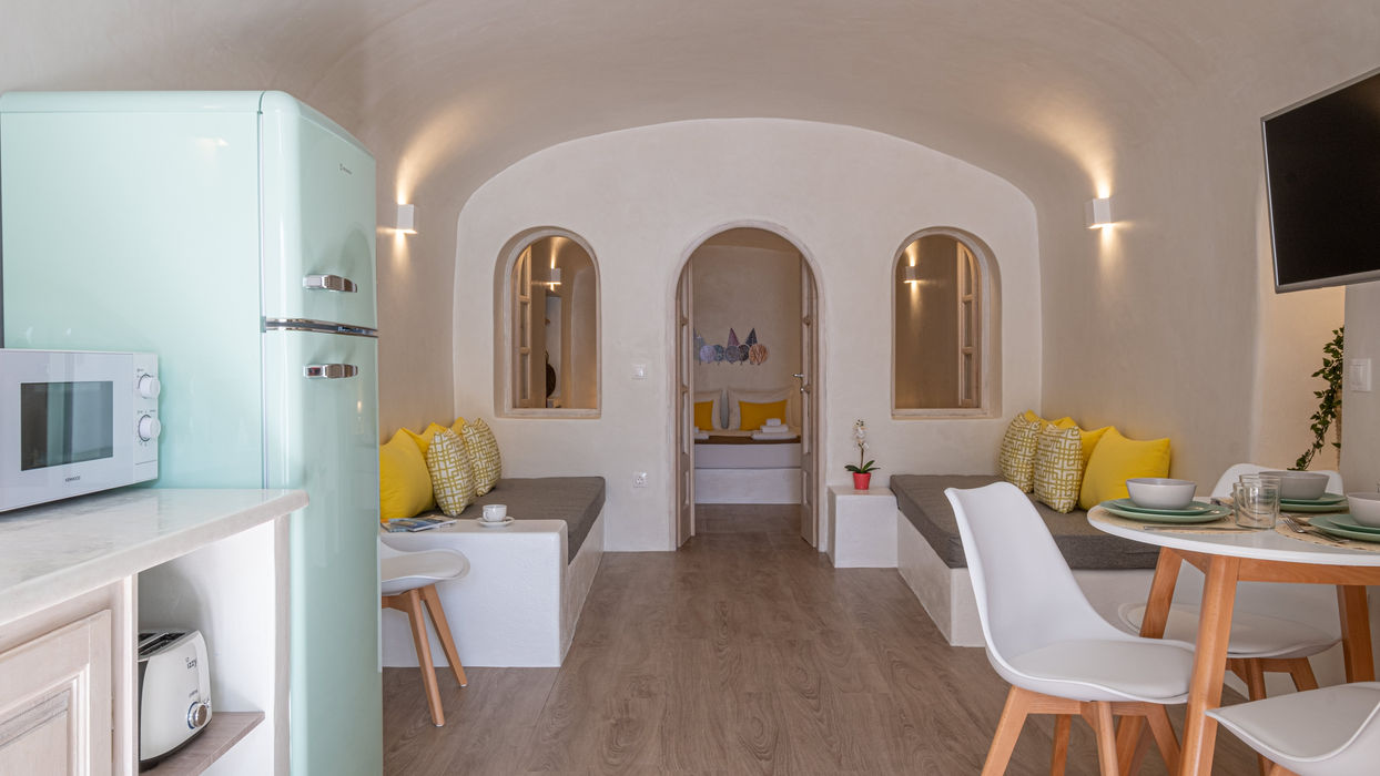 The living room features two built-in sofas that can convert into two single beds, making it a space for both entertainment and relaxation. It comes equipped with a flat-screen TV, and with fully open doors and windows, it provides direct access to the pool and wonderful views of the Caldera and Santorini island.
